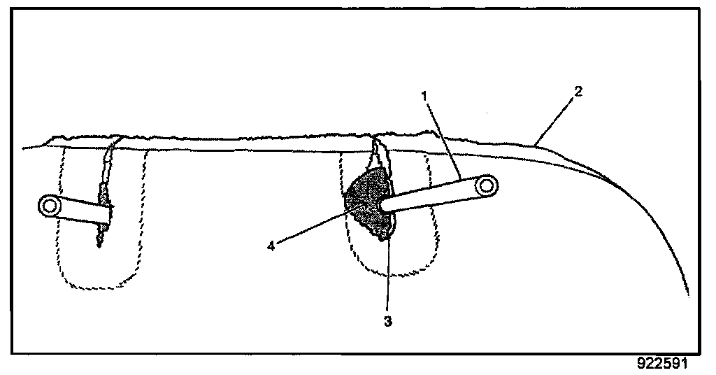 10. With the head restraint support (1) folded rearward, finish inserting the support cover (4) inside the slit (3) in the seatback. Reposition the seatback fabric as necessary to close the slit in the fabric.