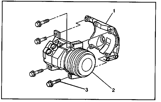 7. Replace the A/C compressor (2) with P/N 15081861. Refer to the Compressor Replacement LR4, LM7, LQ4, L18 w/Denso procedure in the Service Manual (SI 2000 Document ID # 448700).