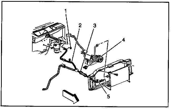 16. Install the A/C refrigerant filter (3), P/N 52474433, to the evaporator tube (2) with the flow arrow pointing towards the evaporator.