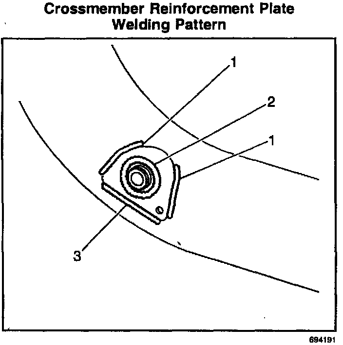 15. The finished weld must consist of four welded beads. Two beads along the side of the reinforcement (1) must be 80 mm (3.20 in). The bead along the lower edge (3) must be at least 90 mm (3.60 in). The final weld (2) should be a continuous bead around the center of the reinforcement to the mounting post on the crossmember. A correct weld bead should measure 120 mm (4.80 in) around the post. Let the weld area cool.