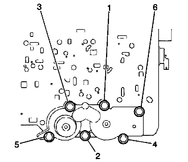 8. Install the six accumulator housing bolts (6). Start the bolts finger tight and work towards the opposite end.