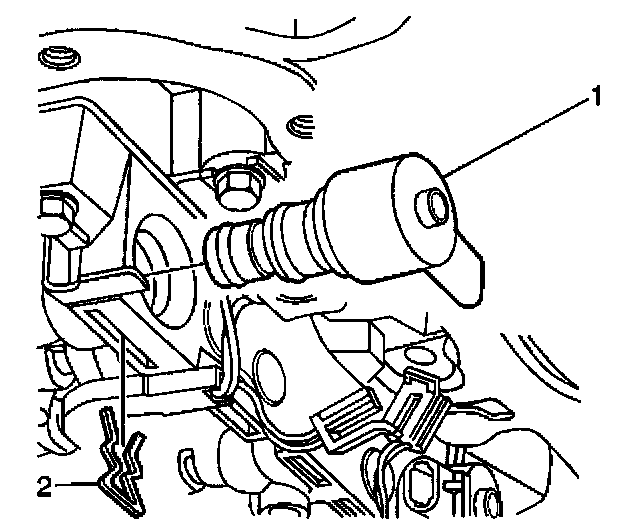 5. Remove the retainer clip (2) and torque converter clutch solenoid (1).