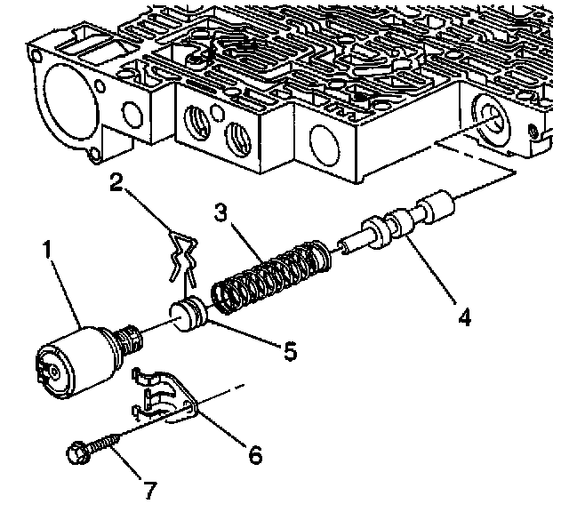 8. Remove the solenoid retainer bolt (7) and the solenoid retainer (6). Remove the pressure control solenoid (1).