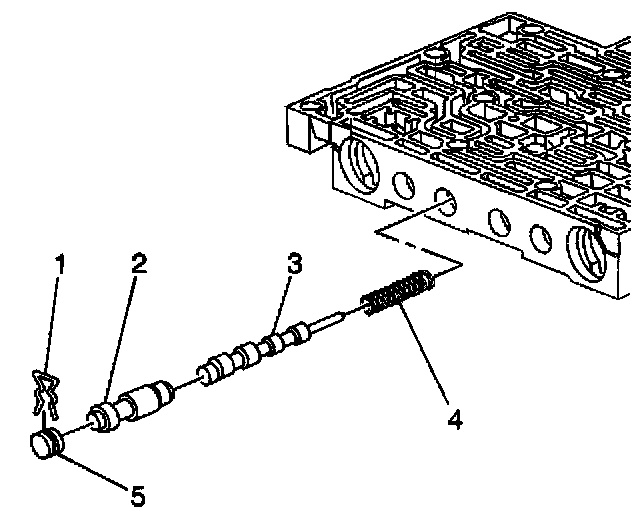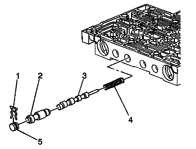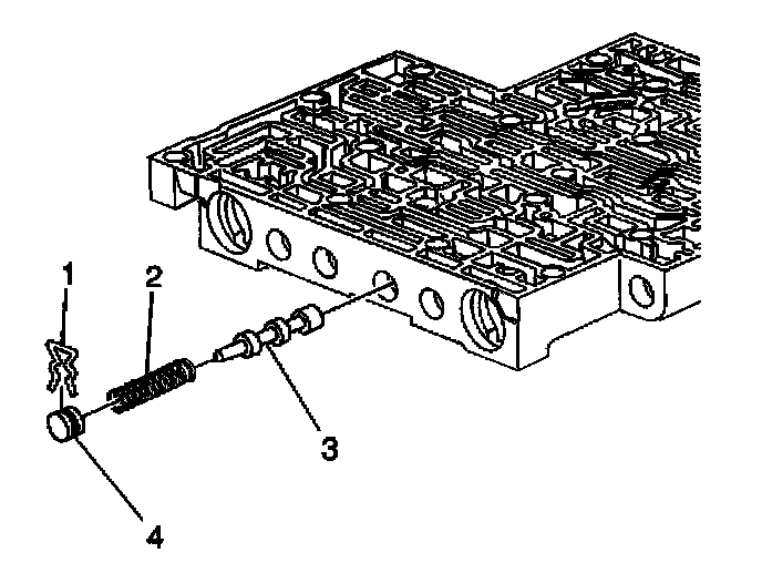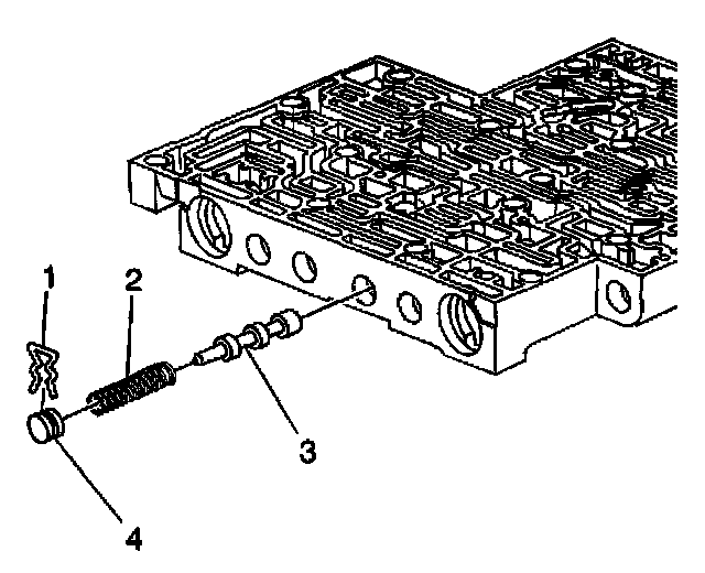 7. Remove the 1-2 accumulator valve (3) and the 1-2 accumulator valve spring (4).
