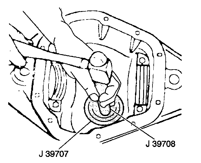 2. Drive the inner bearing cup into the axle assembly using the J39708 and J39707. Make sure the cup is seated on the shims.
