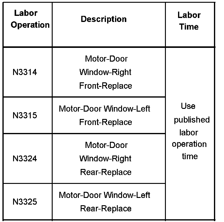 The rear power window motors are also available separately from the power window regulator assembly. The rear power window regulator assembly is not available without the power window motor. If diagnosis leads to a power window motor failure in a rear door, but the power window regulator still works, the entire power window regulator assembly should not be replaced as a warranty repair. Replace either the power window motor or the power window regulator. If diagnosis leads to a power window regulator failure in a rear door, but the power window motor still works, the entire power window regulator assembly will have to be replaced.