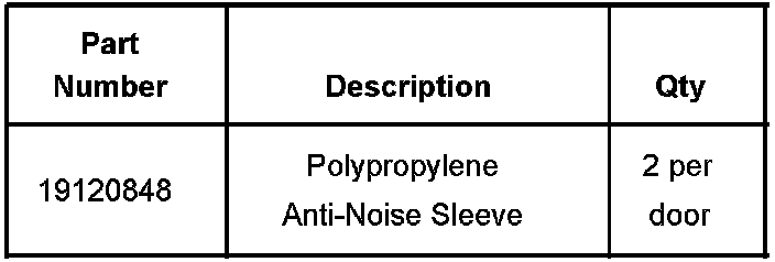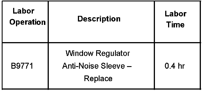 Inspect the rubber anti-noise sleeves on the window regulator support. If either or both are worn, damaged or missing, replace both sleeves (front and rear) with new polypropylene sleeves, P/N 19120848. Do NOT replace the entire window regulator assembly.