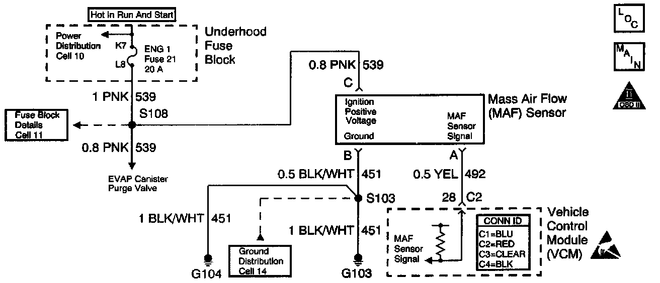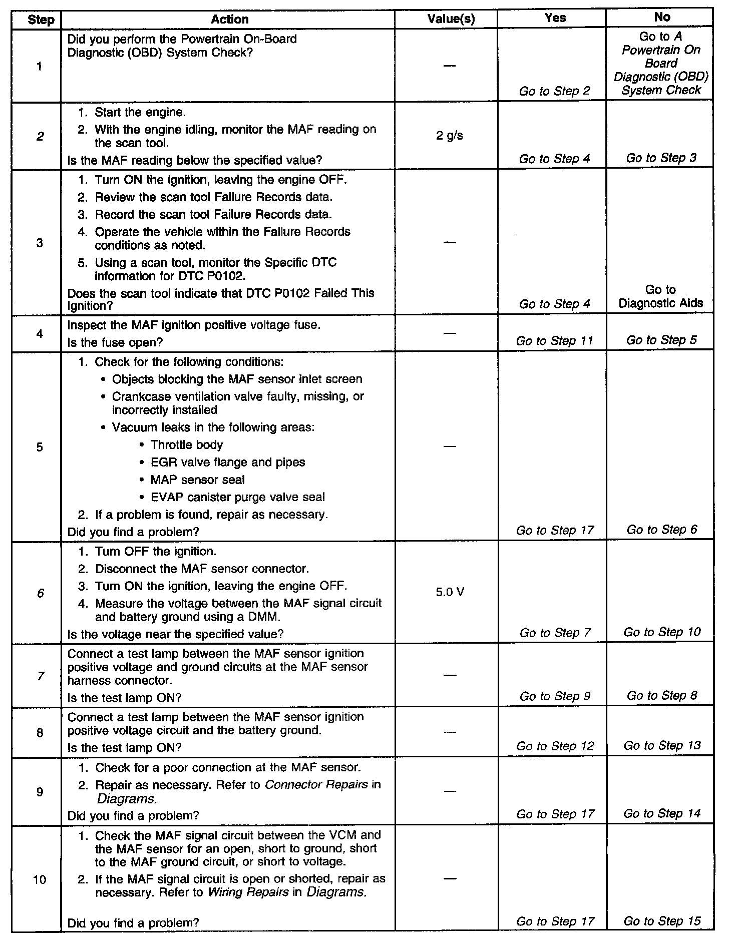 The Mass Air Flow (MAF) sensor is an air flow meter. The control module supplies the MAF sensor a signal circuit. An ignition positive voltage circuit and a ground circuit are supplied to the MAF sensor by independent circuits. The MAF sensor heats a wire element, or grid, within the MAF sensor in order to maintain a calculated temperature. As inlet air flows across and cools the grid, the MAF sensor increases current flow to the grid in order to maintain the constant grid temperature. The MAF sensor converts the grid current flow into a frequency signal. The control module converts the MAF signal frequency into a grams per second value. During low air flow rates, such as at engine idle, the MAF sensor produces a low frequency signal. During high air flow rates, such as at wide open throttle-road load, the MAF sensor increases the frequency signal. The control module monitors the MAF sensor signal frequency in order to calculate the flow and mass of the air entering the engine.