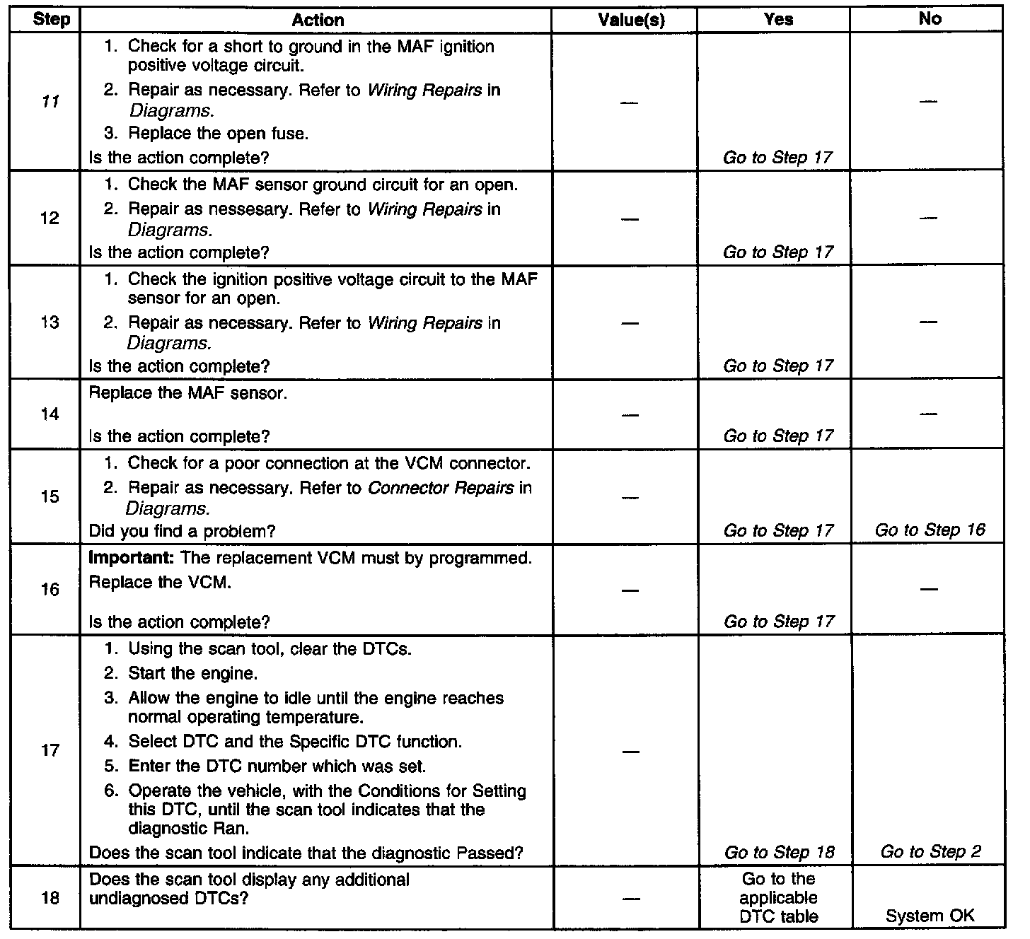 6. A voltage reading of less than 4 or more than 6 volts at the MAF sensor signal circuit indicates a malfunction in the wiring or a poor connection.