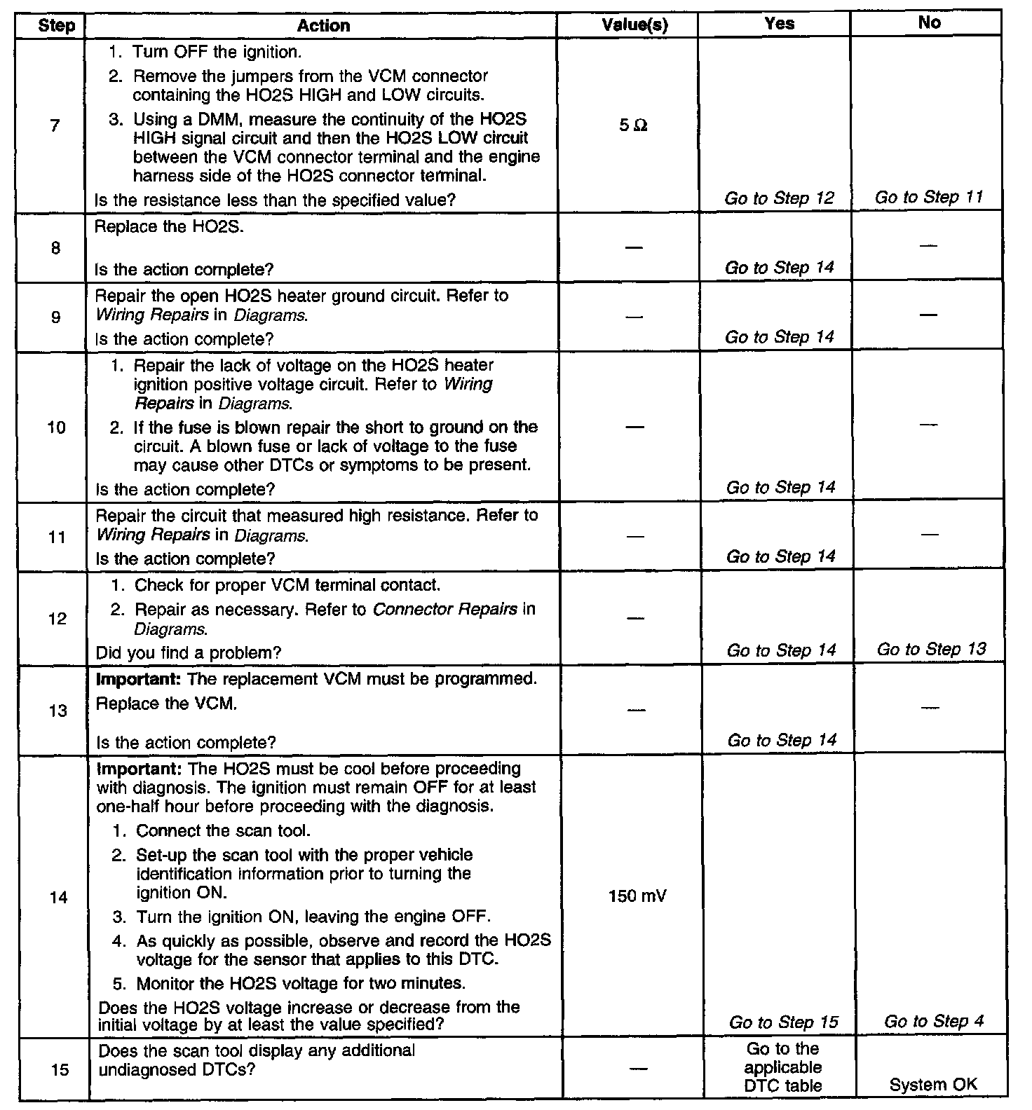 The numbers below refer to the step numbers on the diagnostic table.