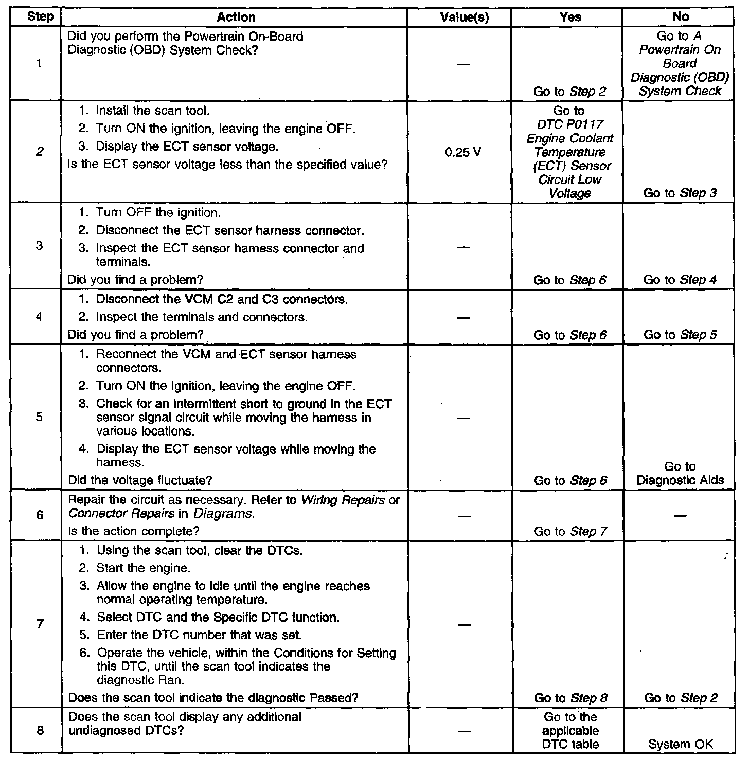 2. If the ECT sensor voltage is less than 0.25 volts, then the condition is present. Even though DTC P0117 did not set, this DTC is more comprehensive and may aid in diagnosis.