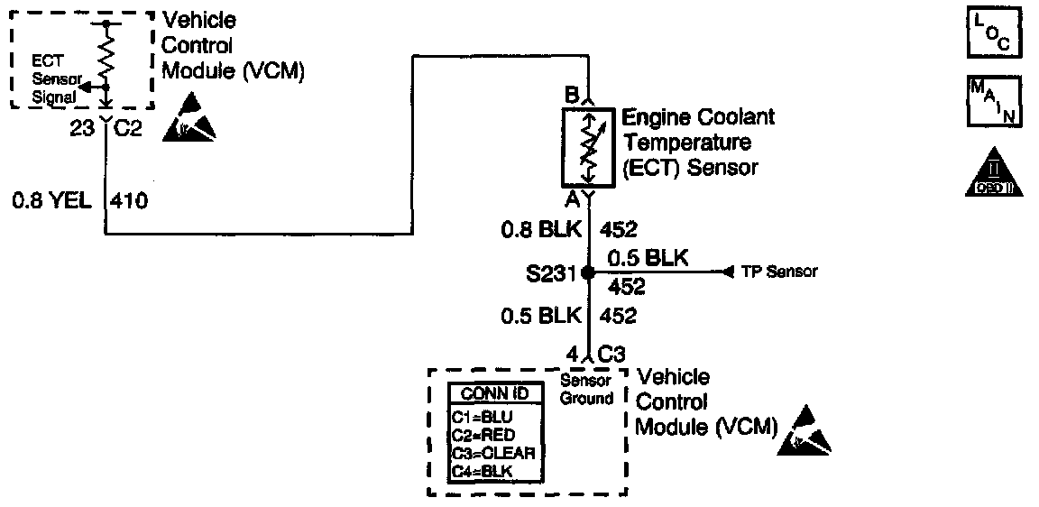 The Engine Coolant Temperature (ECT) sensor is a thermistor. The control module supplies the ECT sensor with a reference voltage on the ECT signal circuit and a ground circuit. When the ECT sensor resistance is high, indicating a cold sensor, the ECT sensor signal voltage remains near the supplied voltage. The ECT sensor decreases the signal voltage as the ECT sensor resistance is low, indicating a warm sensor. The control module monitors the ECT sensor signal circuit voltage in order to calculate the engine temperature.