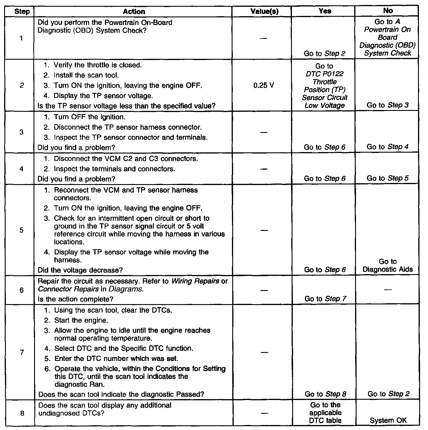 2. If the TP sensor voltage is less than 0.25 volts, then the condition is present. Even though DTC P0122 did not set, this DTC is more comprehensive and may aid in diagnosis.