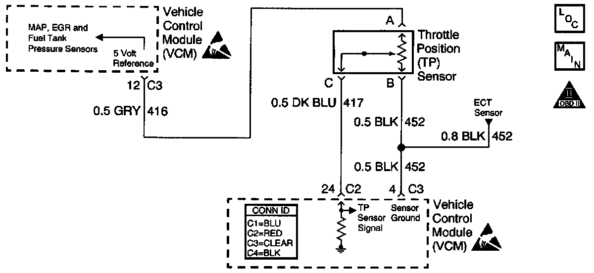 The Throttle Position (TP) sensor is a potentiometer. The control module supplies the TP sensor a reference voltage, a signal, and ground circuits. When the throttle is depressed, the TP sensor signal rises to near the reference voltage. When the throttle is released, the TP sensor signal decreases from the reference voltage. The control module monitors the TP sensor signal circuit voltage in order to determine the throttle blade angle, or opening.