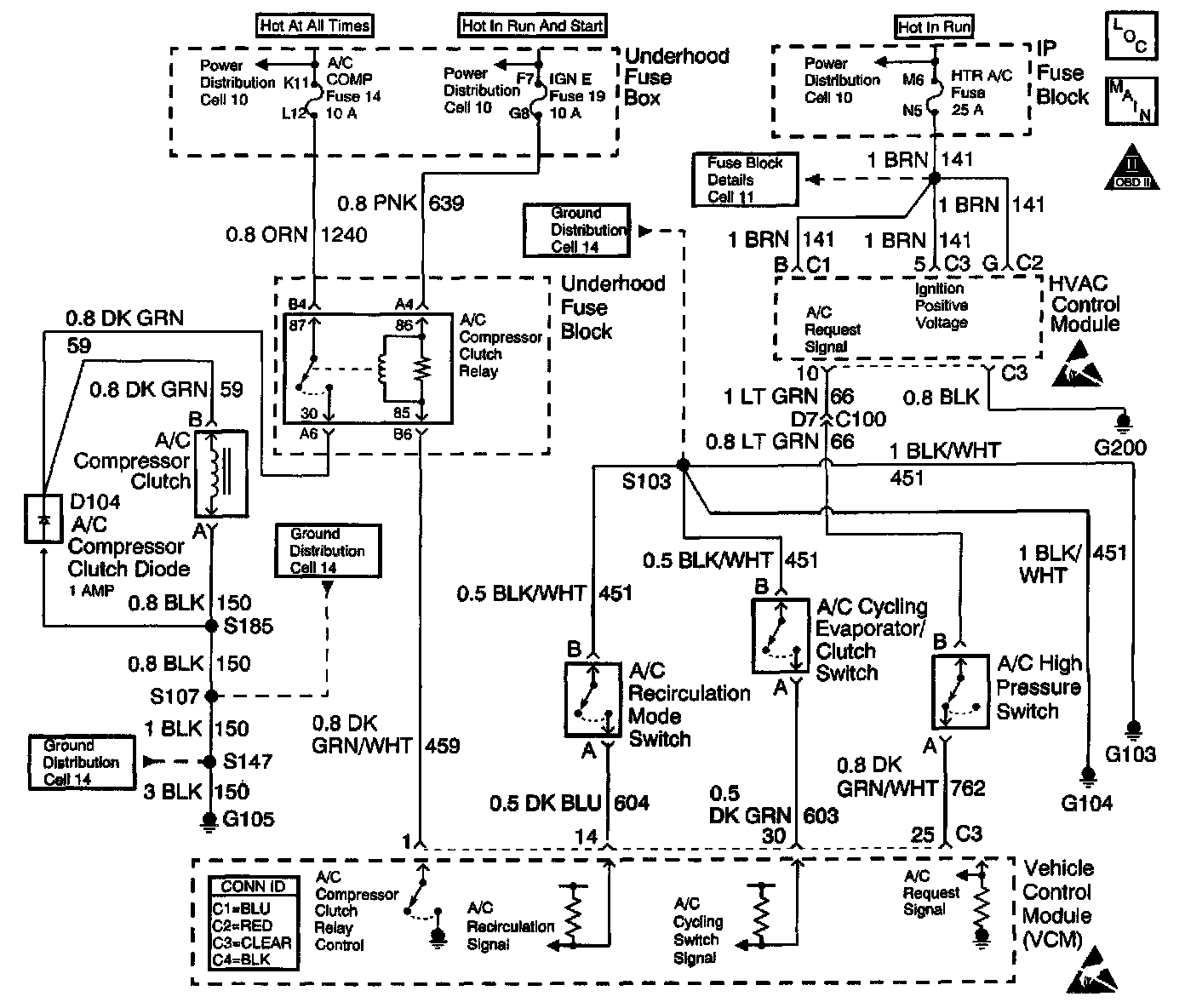 15. The A/C request signal circuit consists of the HVAC control module, the A/C high pressure cutout switch, and the related wiring.