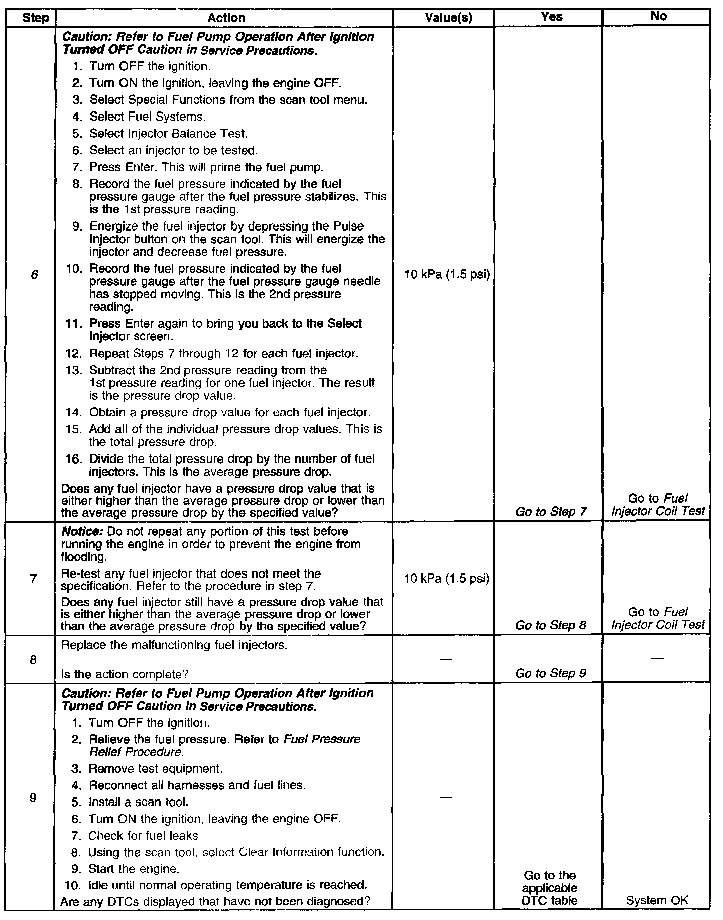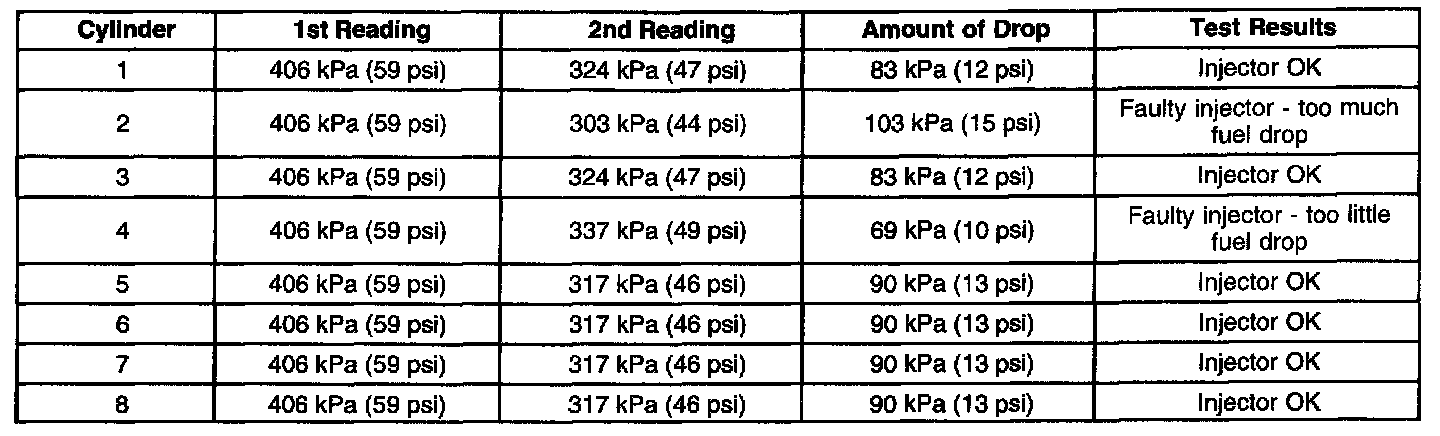 Test Results: Combine all of the injector pressure drops and divide this number by the amount of injectors available. This is the average pressure drop. Each individual injectors pressure drop value must be within 10 kPa (1.5 psi) of the average pressure drop value.