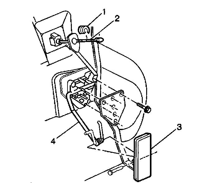 The accelerator pedal (3) through a cable (2) controls the throttle. There are no linkage adjustments. Replace the accelerator control cable with an identical replacement part.