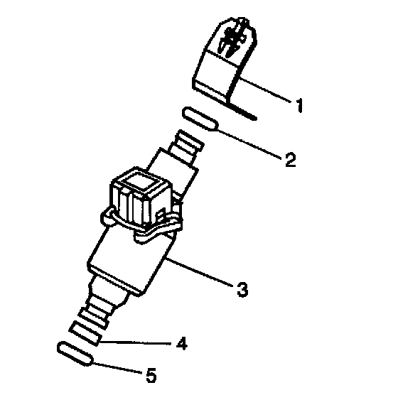 2. Install the O-ring backup (4) and the new injector O-ring seals (2), (5) on the injector.