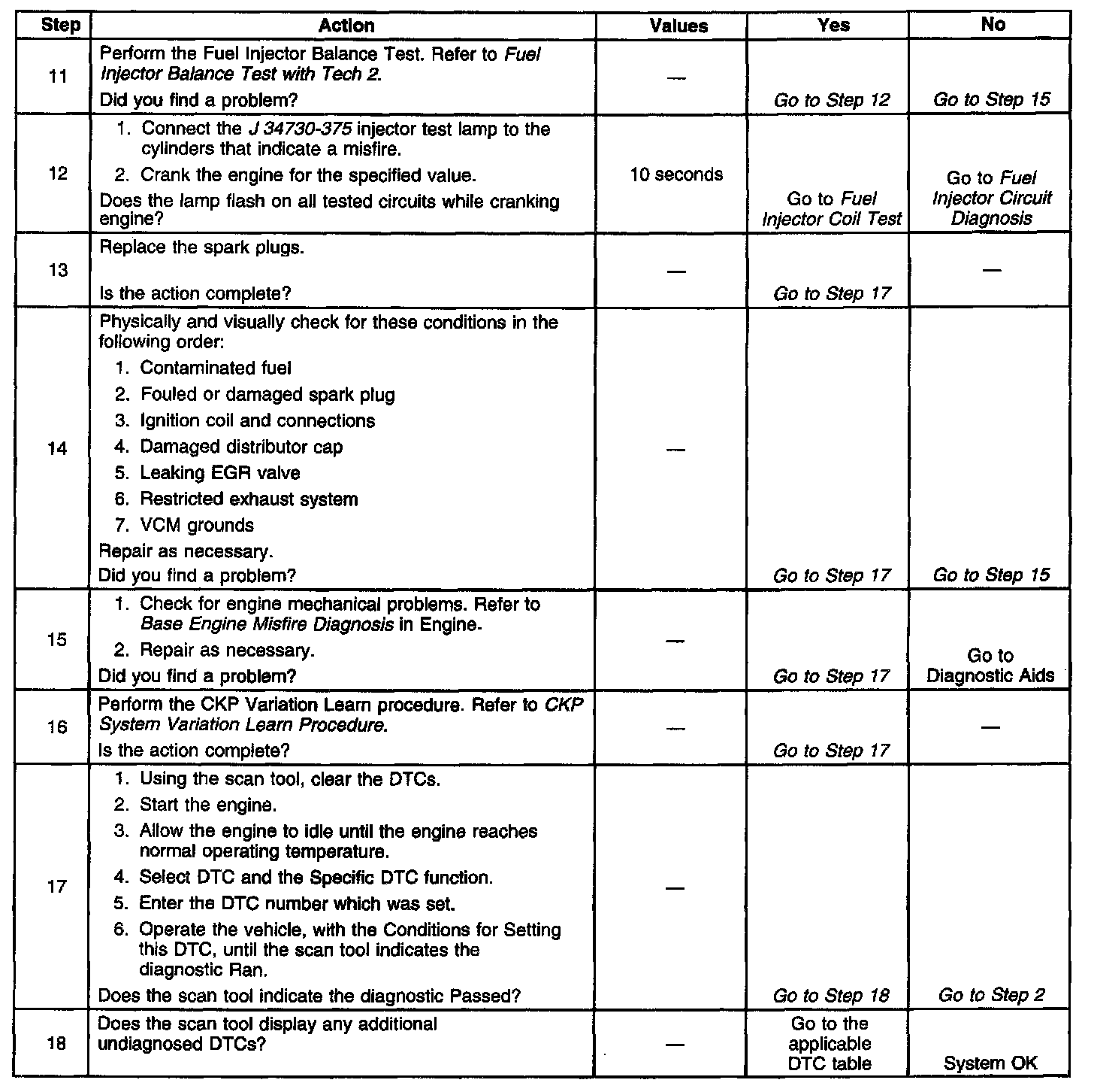When an engine is misfiring, brief decelerations in crankshaft rotational speed will be detected by the CKP. The control module determines which cylinder has misfired based upon the Camshaft Position (CMP) sensor input. Misfire data is stored for each cylinder in separate accumulators. After 100 combustion events, the misfire totals are compared to a calibrated maximum number. If the misfire is excessive, this Diagnostic Trouble Code (DTC) will set.