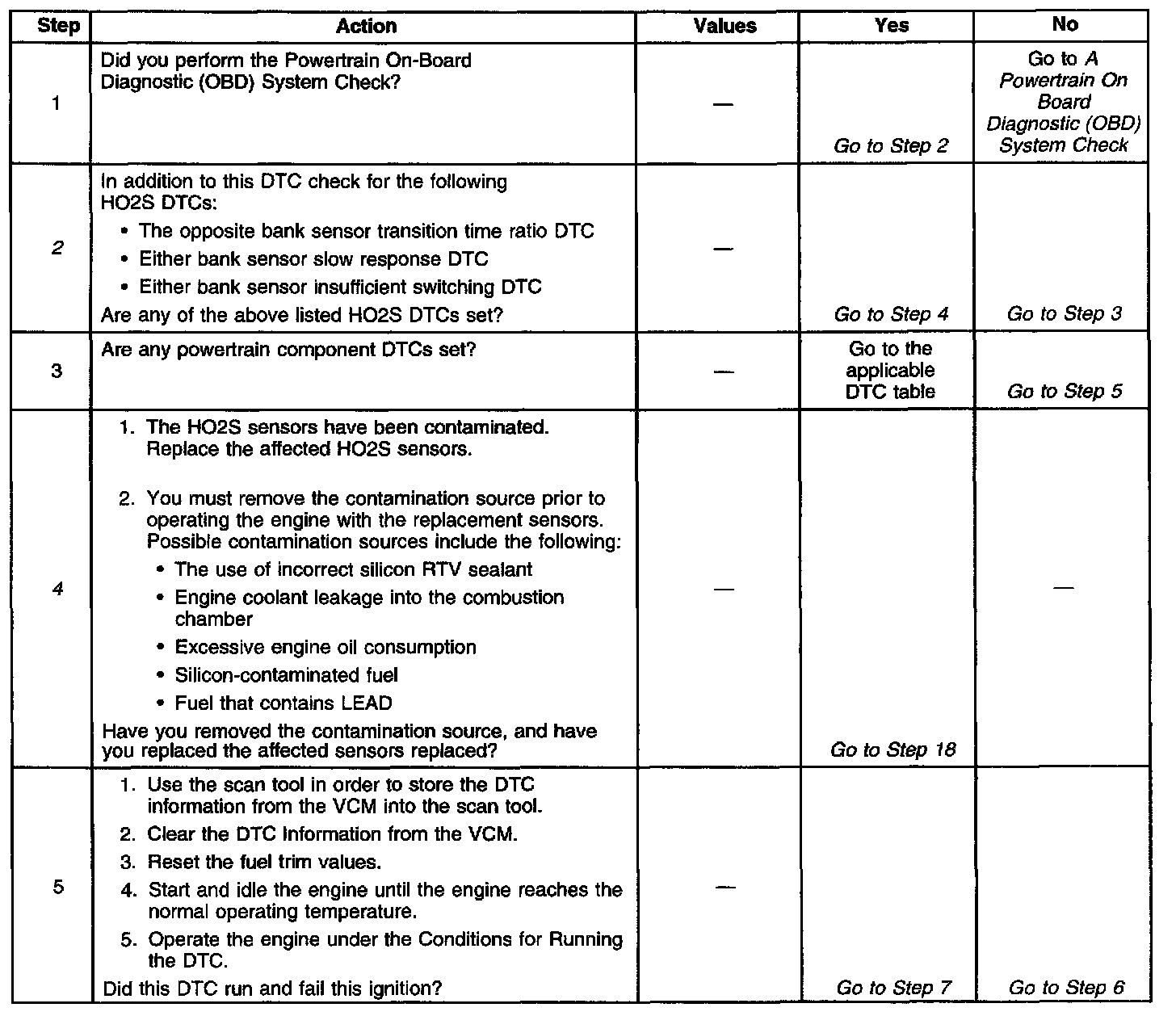 This DTC determines if the difference in transition times from lean to rich or rich to lean has exceeded a maximum ratio. The VCM monitors the time required for the HO2S to transition from a rich (above 600 mV) to a lean (below 300 mV) and vice versa. If either of these times is longer than the other by a calibrated ratio, this DTC will set.