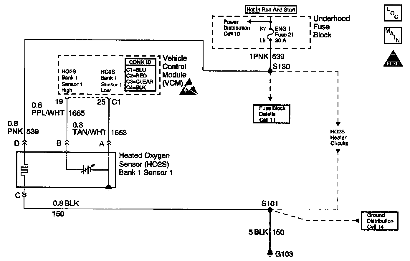 13. If the voltage observed in step 8 is less than the range specified, it indicates a short between the HIGH and LOW circuits, or a short between the HIGH circuit and ground. If you disconnect the HO2S and the Vehicle Control Monitor (VCM), the resistance between the HIGH and LOW circuits, and the resistance between the HIGH circuit and ground should measure infinite.
