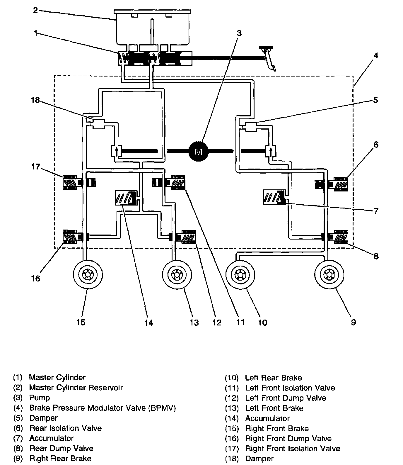 When the EBCM detects that a wheel lock condition will occur, an ABS event begins. During an ABS event, hydraulic pressure in individual wheel circuits is controlled in order to prevent wheel lock from occurring. A separate hydraulic line and 2 solenoids are provided for each brake circuit. The ABS can hold, decrease or increase hydraulic pressure in each brake circuit. However, the ABS cannot increase the hydraulic pressure in a brake circuit above the amount which is applied to the brake pedal during braking.