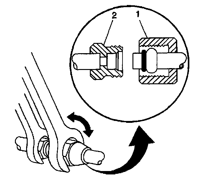 7. For compression-style fittings; use a back-up wrench on the A/C refrigerant component (smaller size) fitting (2), then tighten the A/C refrigerant hose (larger size) fitting (1) to specification.