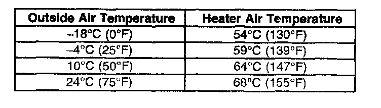 Use an accurate thermometer in order to determine the temperature of the outside air and the temperature of the air discharged at the floor outlets. The minimum acceptable heater output temperatures at 4 different outside temperatures are represented in the table.