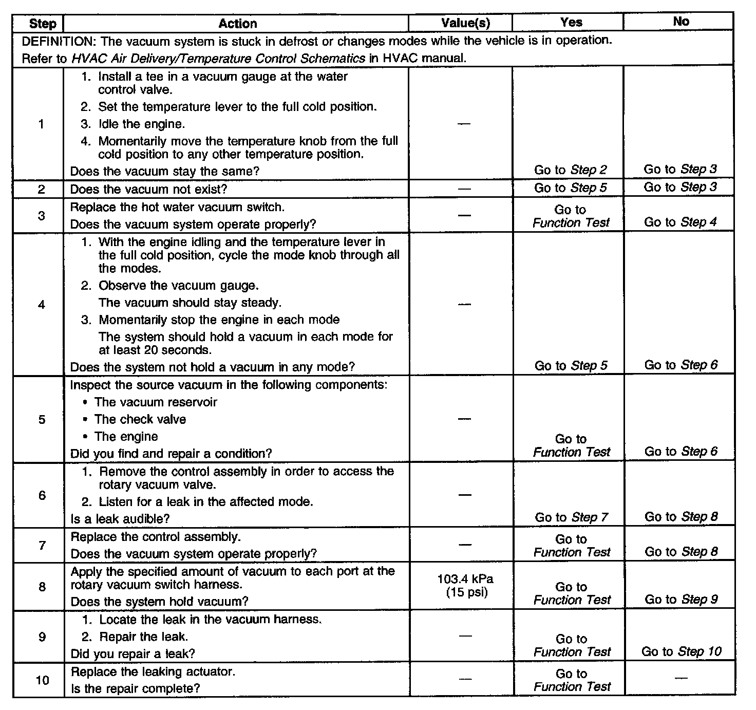 If the airflow through the vents changes modes when the vehicle is in operation, or if the airflow remains in any mode and does not change, diagnose the system using the table below.