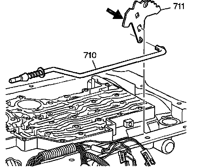 Important: Do not apply excessive force, prying or hammering to any of the parking mechanism parts. This could cause the parking system to fail.1. Remove the manual shift shaft detent lever (711) and the parking pawl actuator assembly (710).