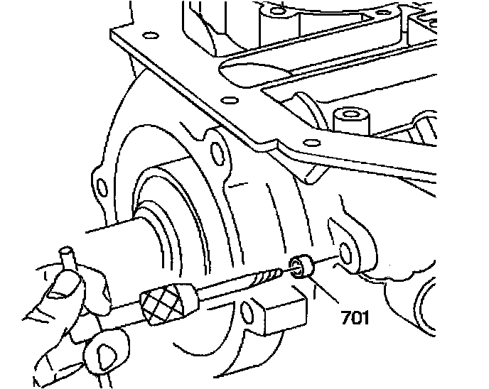 7. Remove the parking pawl shaft hole plug (701) from the transmission case using a screw extractor.