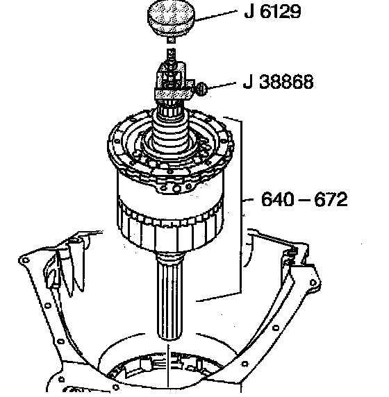 10. Remove the center support and gear unit assembly (640-672) by lifting the J 38868 with the J 6129.