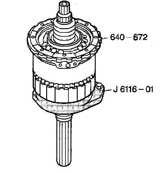 12. Place the center support and gear unit assembly (640-672) into the J 21364-A (not visible in the illustration) and then into the J 6116-01.