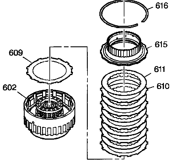 13. Install the steel and composite forward clutch plates (610, 611). Alternate the clutch plates, starting with the steel clutch plate (5 steel and 5 composite).