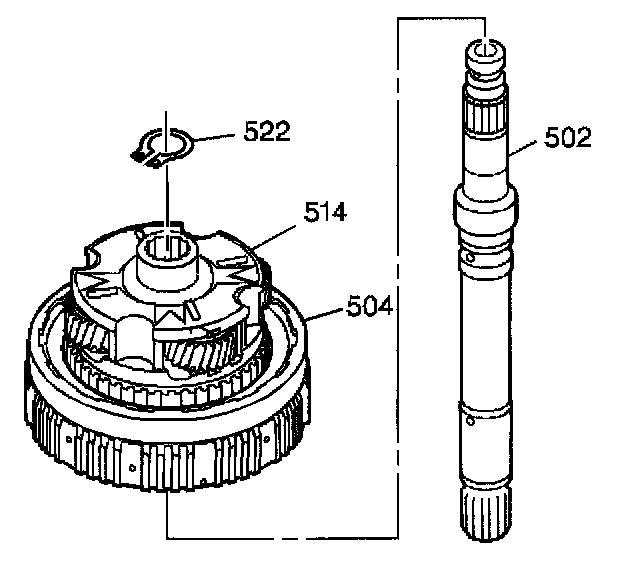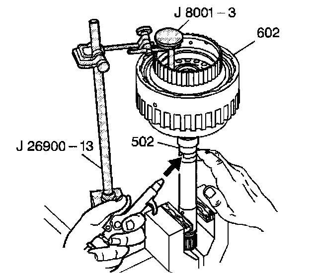 7. Apply air to the other side of the forward clutch fluid passage in the turbine shaft (502). The piston travel is 1.27-4.369 mm (0.050-0.172 inch).