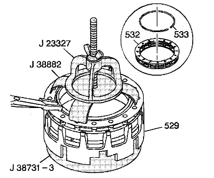 5. Compress the fourth clutch spring assembly (532) using the J 38882 and the J 23327.