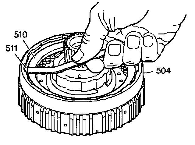 Place a feeler gage between the overrun clutch backing plate (510) and the overrun clutch backing plate retainer ring (511). The clearance should be