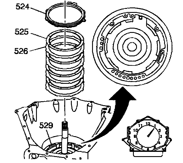 ^ Install the fourth clutch steel plates (526) with the V notch tang at the one o'clock position in the fourth clutch housing