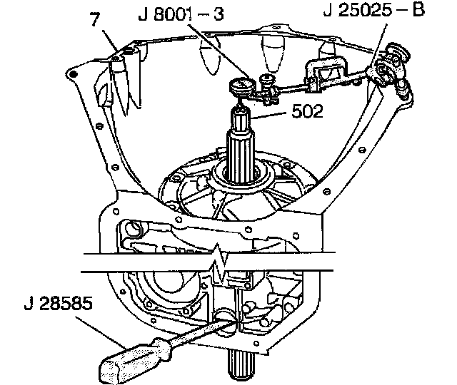 6. Pull up on the turbine shaft (502) while holding the output carrier up with the J 28585. Proper end play is 0.102-0.559 mm (0.004-0.022 inch).