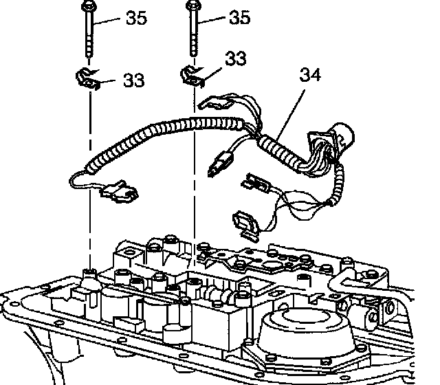 2. Remove the transmission wiring harness assembly (34) from the wiring harness clamps (33).