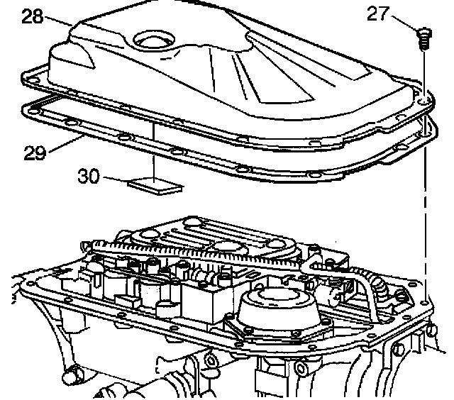 2. If the transmission oil pan magnet (30) was removed, install the magnet into the transmission oil pan (28).