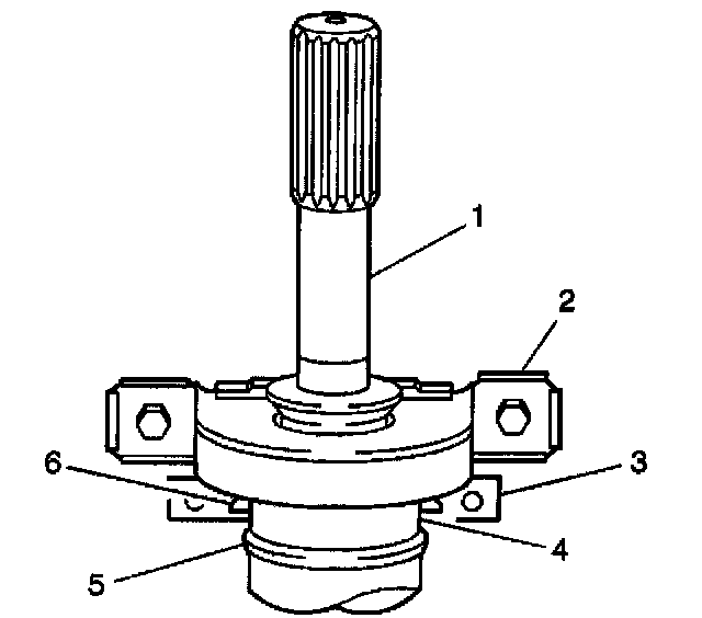 4. Position the J 37623 (3) onto the shaft between the circular can (4) of the center bearing assembly (2) and the weld shoulder (5) of the propeller shaft. The taper (6) of the J 37623 (3) should be pointing towards the center bearing assembly.
