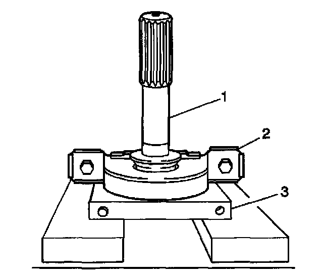 1. Install J 37623 (2) onto propeller shaft (1) at weld shoulder (3) with taper of tool pointing away from the splined stub shaft.
