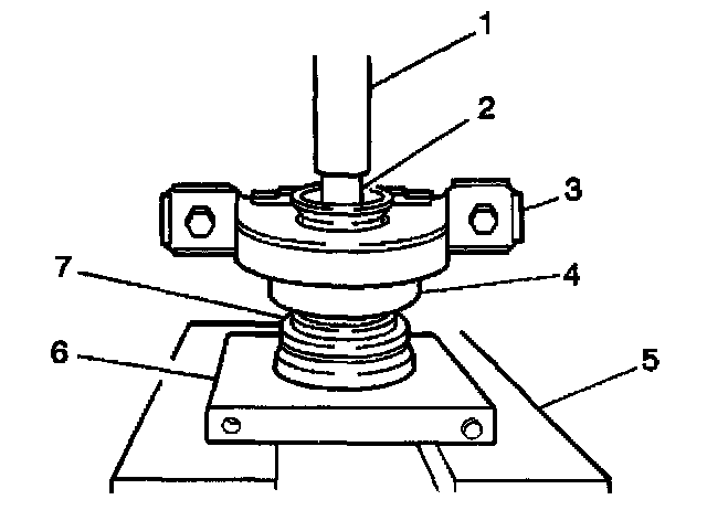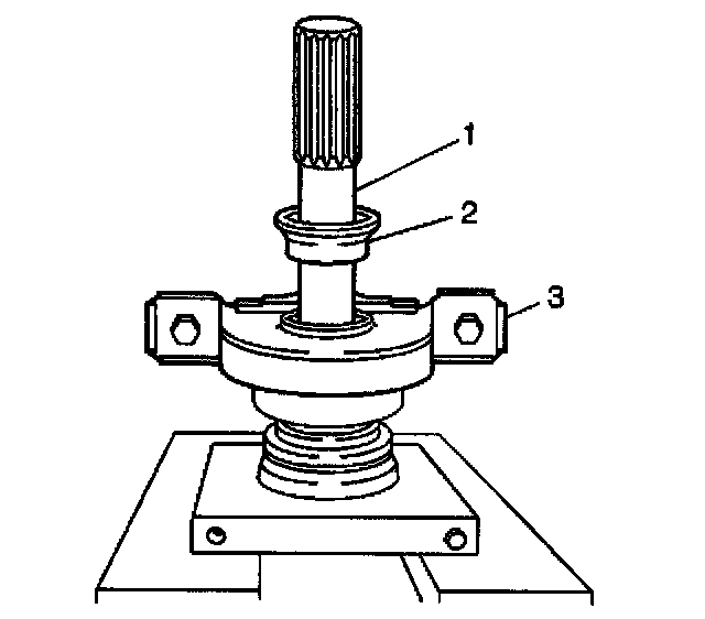 5. Stand the propeller shaft (1) on end in the press with the J 37623 (3) supporting the center bearing assembly (2) under the circular can.