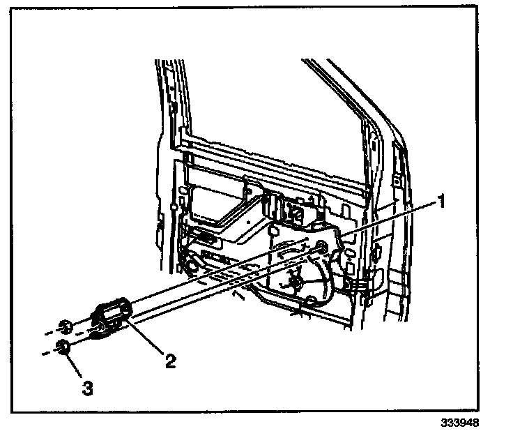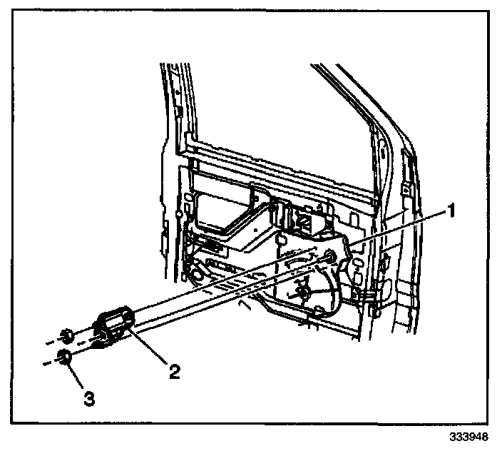 2. Install the nuts (3) in order to retain the power window motor (2) to the front door module (1).