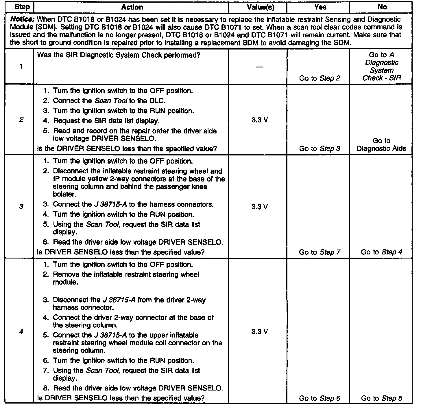 A short to ground in the inflatable restraint steering wheel module circuit may cause an intermittent condition. A DTC B1024 would be accompanied by DTC B1071. Inspect CKT 347 and CKT 348 carefully for cut or chafed wires. A careful inspection of the circuits and components indicated on the DTC B1024 table is essential in order to prevent damage to the replacement inflatable restraint Sensing And Diagnostic Module (SDM). The diagnostic table directs the technician to note the entry value of DRIVER SENSELO. Comparing the value of DRIVER SENSELO may be helpful in determining if an intermittent condition exists.