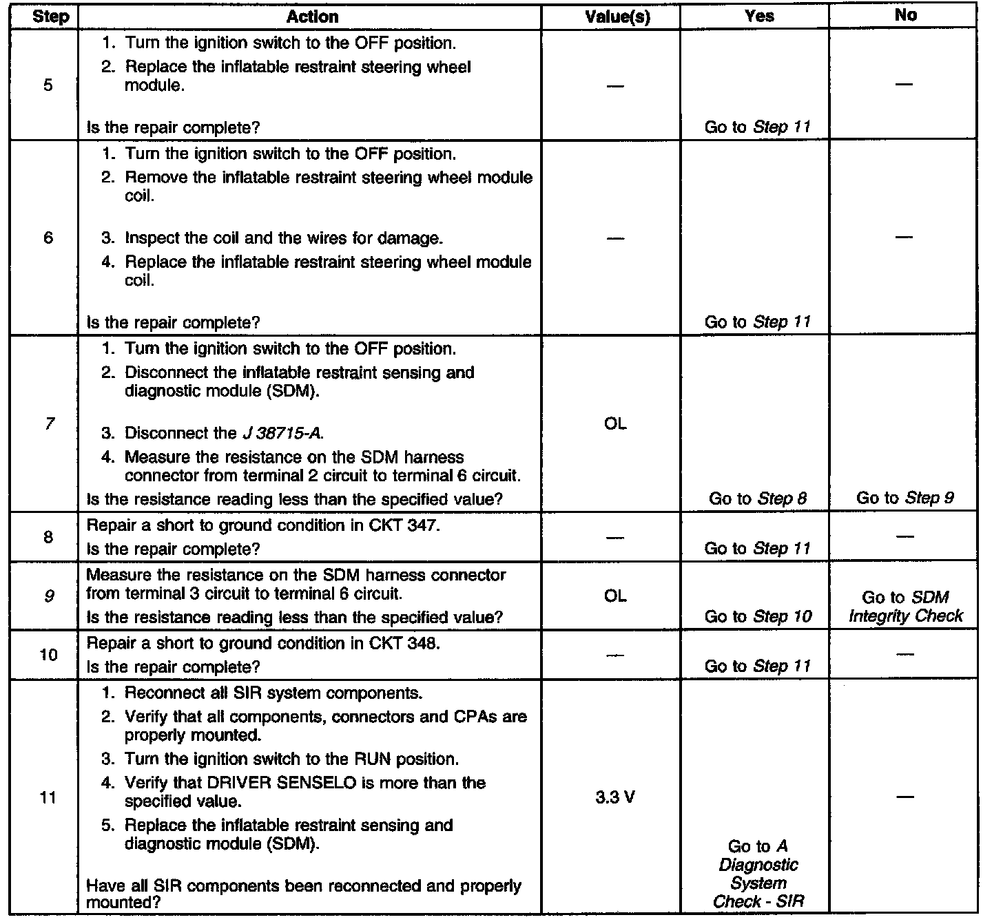 2. This test determines the driver side low voltage which is measured by the inflatable restraint Sensing And Diagnostic Module (SDM). A reading of 3.3 V or more indicates that an intermittent condition may exist.