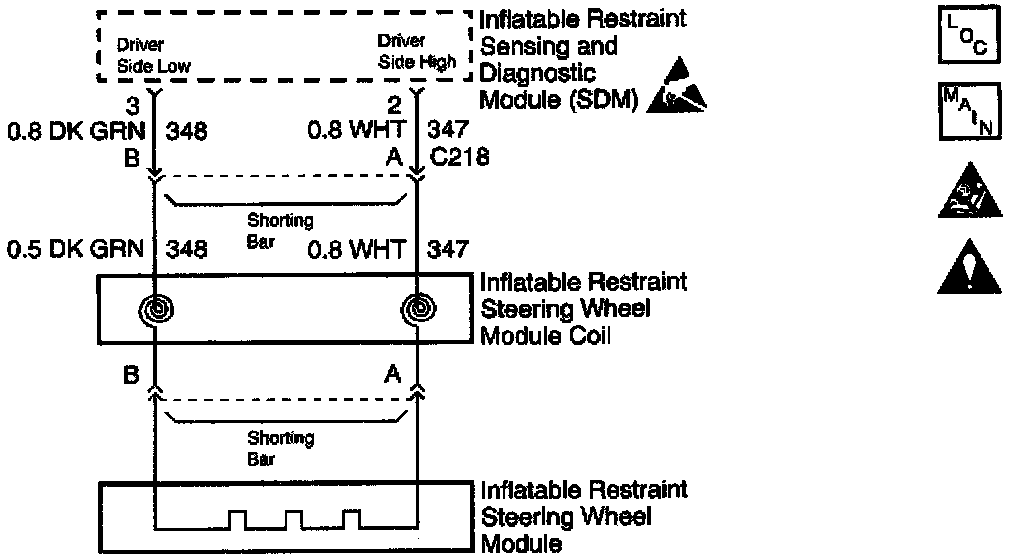 The SDM monitors the voltages at DRIVER SIDE LOW terminal 3 and PASSENGER SIDE LOW terminal 4 to detect shorts to ground in the inflator module circuits. The service wait time is 10 minutes. Refer to SIR Service Precautions.