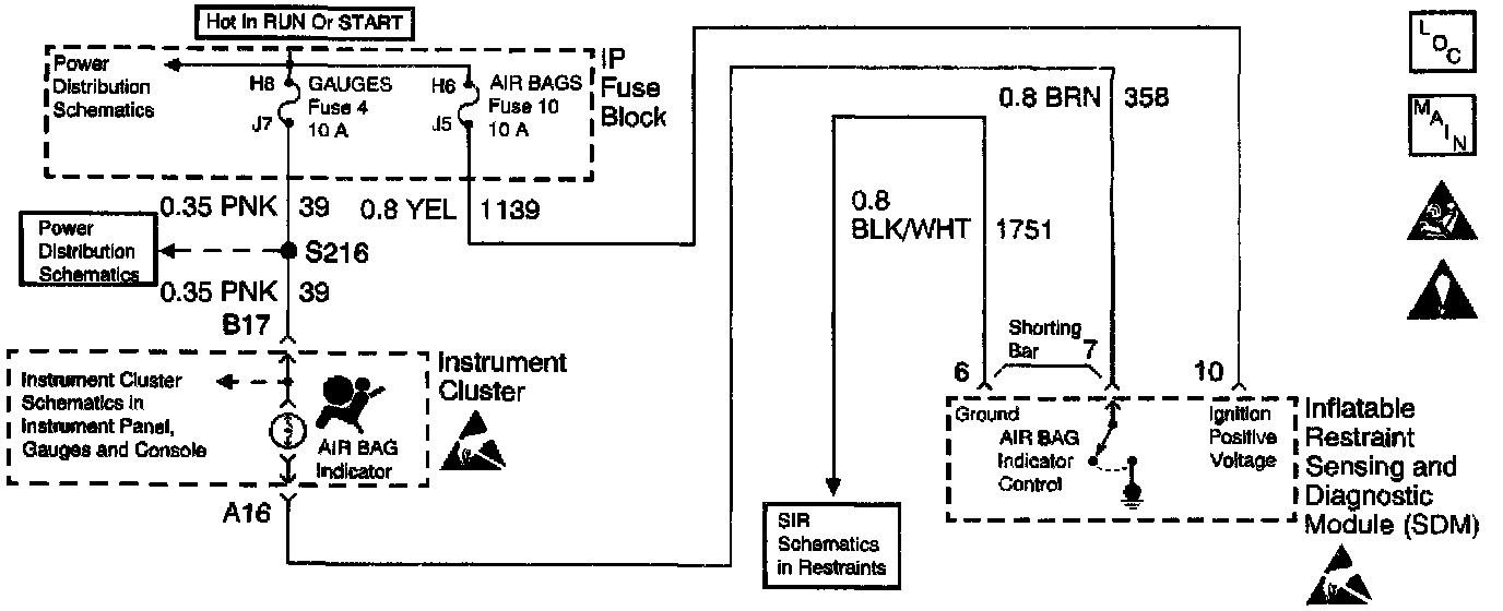 When you turn the ignition switch to the RUN position, voltage is applied to the AIR BAG warning lamp as well as the inflatable restraint Sensing And Diagnostic Module (SDM) at terminal 10. The inflatable restraint Sensing And Diagnostic Module (SDM) responds by flashing the AIR BAG warning lamp 7 times. The SDM monitors the lamp driver output by comparing the output state at the AIR BAG Indicator Control terminal 7 to the microprocessor commanded state.