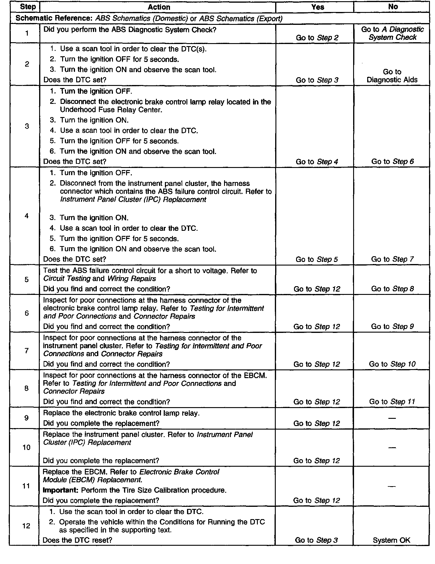 The ABS indicator is illuminated via a normally open ground circuit in the EBCM. When the ABS indicator is commanded on, the feedback voltage to the EBCM from the ABS failure control circuit is low.
